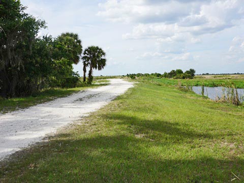Peavine Trail is a former rail bed (1910) that led to Kenansville, but was dismantled in favor of Henry Flagler's railroad to the east. Beginning smooth, after 1/4 mile the trail crosses Seven Mile Slough where there's a waterhole full of alligators. We biked on, but the trail became much rougher. Past the South Pasture Trail, where the Cattle Lease Pasture Area* starts, we recalled reading some advice: "embrace the prairie by looking into it ... not at it" - impossible when biking in the rough, so we soon turned and walked much of the way back ... looking into the prairie. Under 2 miles round-trip on this day, but an interesting find - alligators, birds, slightly elevated views, and we stayed dry crossing the slough(!) - mountain bikers would surely go further.