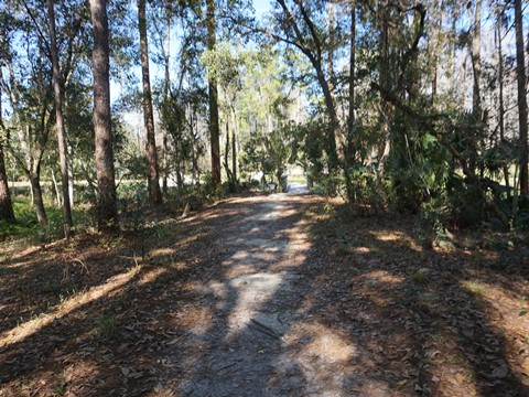 Once through the gate into the Management Area, there's an intersection in 1/10 mile. Go straight (north) along a powerline the Pine Island West Loop Trail and Marriott Trail (when open). Go right (east) along another powerline to continue to Shingle Creek and Hunters Creek Middle School Trailhead - this is the more popular route. The trail runs along a canal where we saw many birds and an alligator. Note: much of the ride here is in a deep rut, so it's wise to ride with eyes to the ground. Thus, we frequently stopped to enjoy the wildlife. In 3/10 mile, there's a turn-off (north) to the Pine Island East Loop Trail (very uneven) and picnic area. Continue straight for another 7/10 mile to Shingle Creek. There's a bridge over the creek, but this area is restricted - so go right across a boardwalk into the shade to continue to Hunters Creek Middle School.