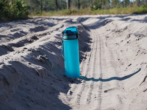 We didn't get too far here, though a biker (on mountain bike) went zipping past us with a wave and smile. The trail is fairly rideable to Marker #33 (East-West Connector) and then to where the Main Hiking Trail branches off, but after that the sand was too deep and we turned around. We set a water bottle in one of the tire ruts from a park vehicle to show how deep the sand was.