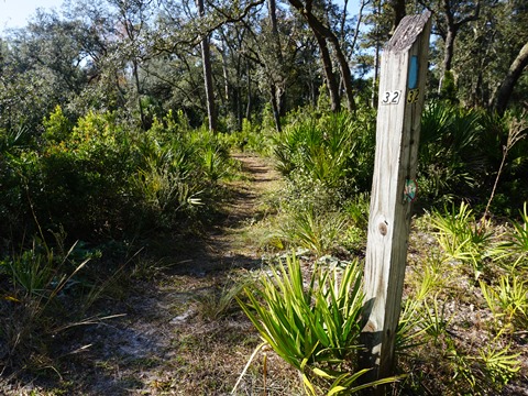Starting from the Sand Lake Trailhead, we biked a loop going west, then south, and return (partly on the paved park road). Given that (1) our most comfortable biking is on paved bike trails and (2) we don't have mountain bikes, this trip might better be called "bike-hike" since we walked several sections due to sand or other obstacles - but that's just us, in most places those with mountain bikes will fare better. We enjoyed the walking, though, better to enjoy the tranquil surroundings. The trails overlap, so at times we were on shared hiking and/or equestrian trails. On a clear, dry and cool day in December, we saw no horses and few walkers, but many bikers! Note: Weather can affect trail conditions, sections can be muddy or even flooded. (The park trail map can help visualize our route - from Sand Lake Trailhead, past markers #32, 31, 30, 29, 10, 9, 8, 7, then back on the park road to return to trailhead.).