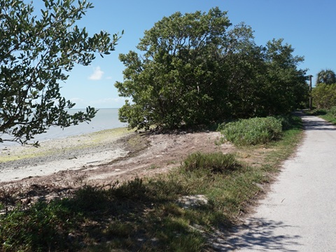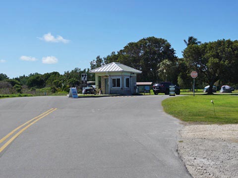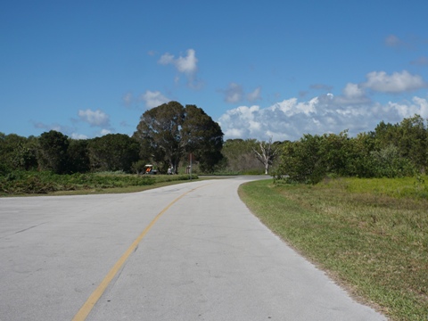 Exiting the Guy Bradley Trail, bike onto the park road - a restroom and parking are available here. The road passes the Bayside walk-in camping area (closed when we visited) and the eco-tents, then leads to the main campground, about 4/10 mile. Smooth pavement, watch for cars. Unshaded.