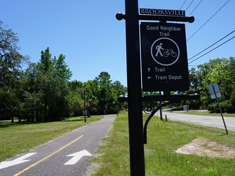 The Good Neighbor Trail, part of the Florida Coast-to-Coast Trail, runs 13 miles at Brooksville. Starting from near the intersection of SR 50 and Cobb Rd. (where it meets the connector along Cortez Blvd. to the Suncoast Trail), the trail runs through Brooksville along a former Florida Southern Railroad narrow gauge railway line to the Withlacoochee State Forest and a link to the Withlacoochee State Trail. (Map link and photos below.)