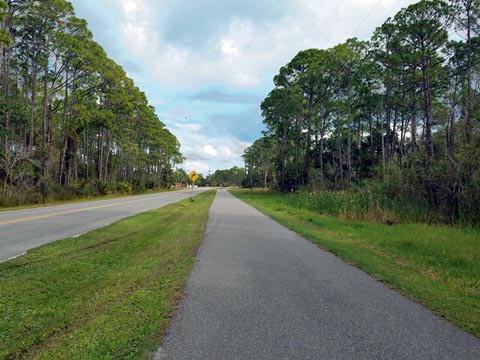 Keaton Beach Coastal Park, across from the Keaton Beach Boat Ramp, offers parking, restrooms, and picnicking. The bike path starts from the parking lot, winds around the Park and then crosses CR 361 (Beach Road). From here it runs alongside the roadway to Dark Island Road, including some views of marsh and wetlands. The road to the boat ramp can be busy with vehicles pulling trailers, so the path is a welcome way for locals with bikes and golf carts to get around. Note: the actual beach is at Hodges Park (small beach, pier, picnic, playground), along the canal and down the street from Coastal Park.