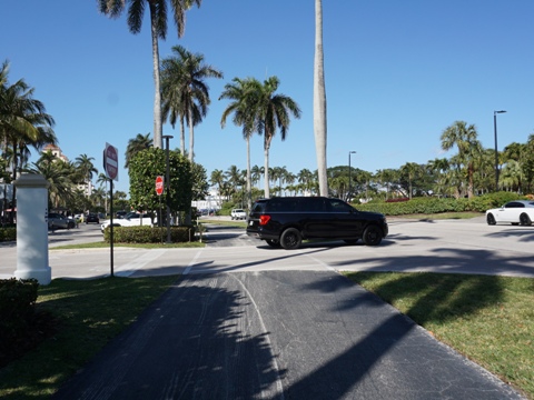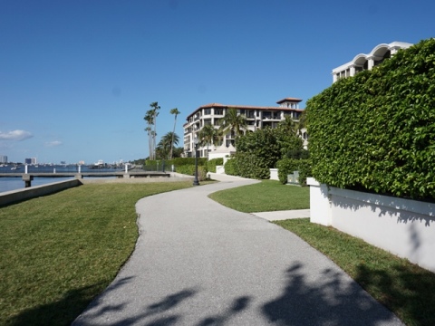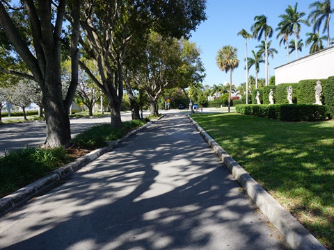 From the Flagler Museum, the trail runs roadside along Whitehall Way, then Coconut Row past The Breakers and Royal Poinciana Shopping Center. At Royal Poinciana Way, turn left. The trail follows the road to the Flagler Memorial Bridge ramp - bear left down to the Lagoon. The underpass at the bridge is a big plus.